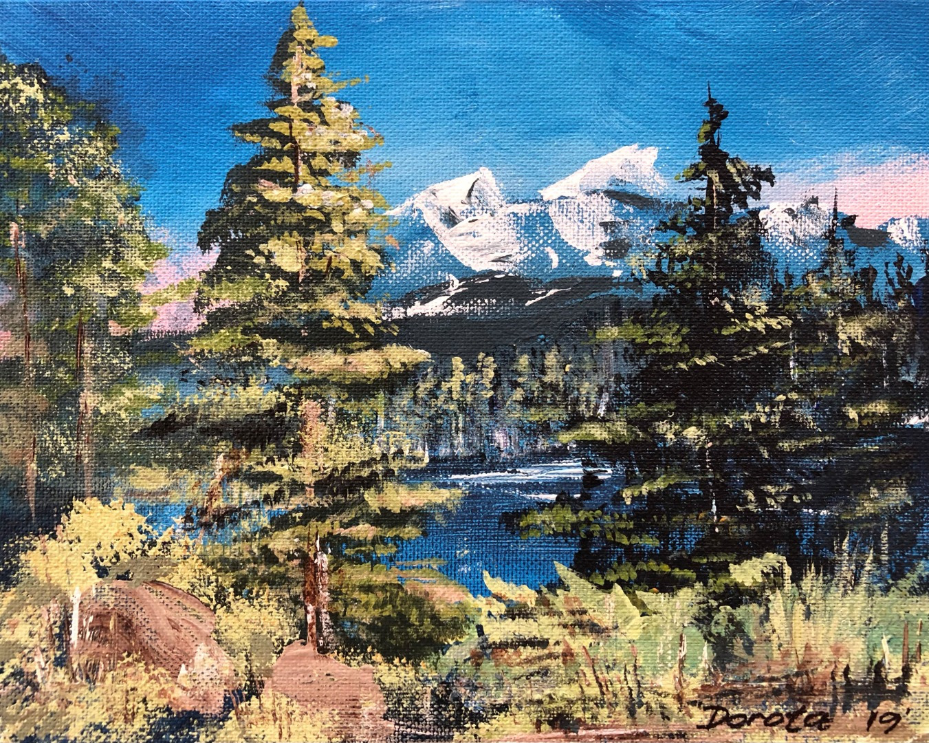 During the scary wave of Covid David Jr came to live with us while completing his UVic Science degree. He was the one who introduced me to the legend of Bob Ross. Not growing up here I have never seen his shows. Not my “cup of tea” but I suggested to Jr that we paint along Bob together. I was amazed how quickly my son invented a “happy accident” when his pinkish sky turned out too red and too dark. He found an ice capped mountain image and reworked his sky into lovely mountains.. It turned so nice I have decided to add some white mountains to my composition as well. We also toned down Bob’s color choices a lot.